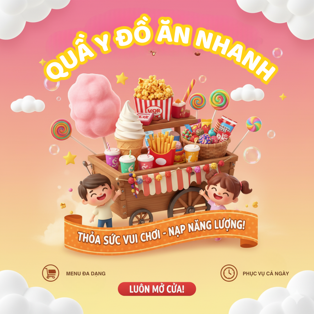 Khu vực ăn uống và đồ ăn nhanh phục vụ gia đình sau giờ vui chơi.